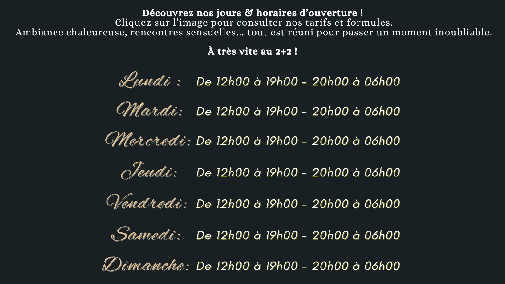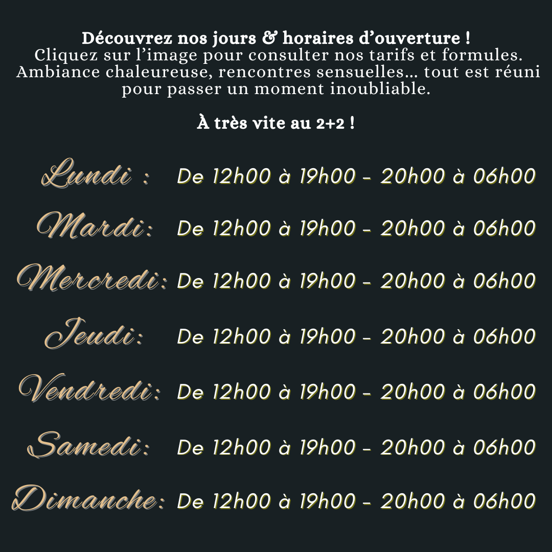 Le Club est ouvert du lundi au dimanche de 12h00 à 19h00 et de 20h00 à 06h00.