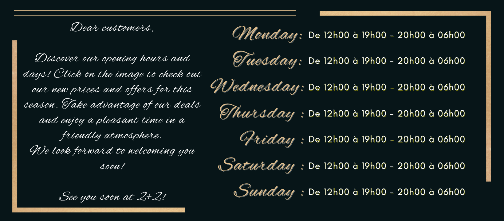 The Club is open Monday to Sunday from 12:00 p.m. to 7:00 p.m. and from 8:00 p.m. to 6:00 a.m.